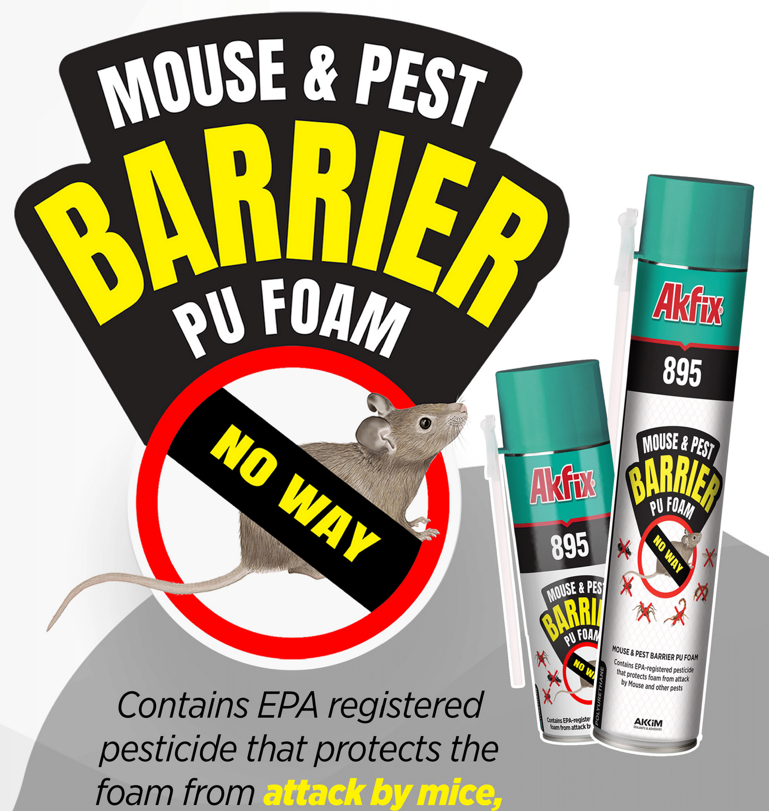 Akfix Mouse & Pest Barrier PU frauðið inniheldur Diphenylmethane-4 og 4’-Diisocyanate. músa- og skordýraeitur sem kemur í veg fyrir að meindýr komist í gegnum þéttifrauðið.