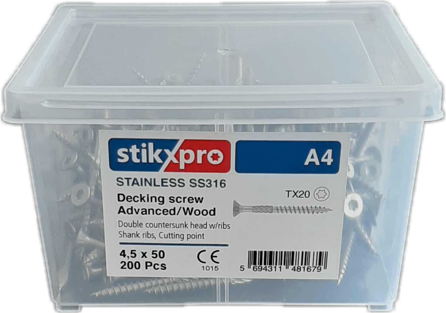 StikxPro pallaskrúfur koma í handhægum plastboxum með handfangi þannig að það er auðvelt að halda á skrúfupökkunum og þeir skemmast ekki þó það rigni á þá. Boxin er einnig hægt að nota áfram t.d. til að geyma skrúfur í, eða sem berjabox svo eitthvað sé nefnt.