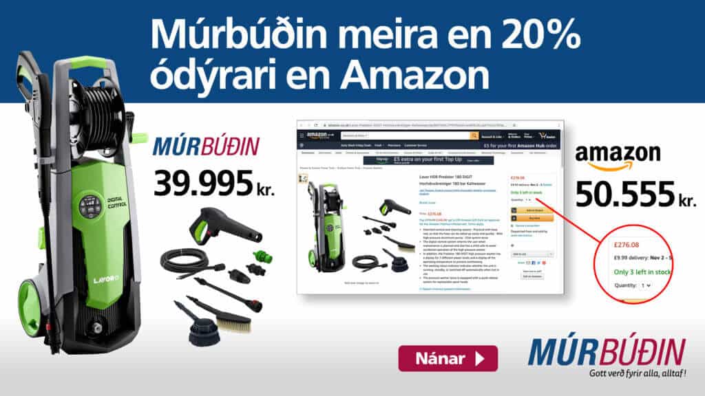 MÚRBÚÐIN ER MEIRA EN 20% ÓDÝRARI EN AMAZON VEFVERSLUNIN! GETUR VERIÐ AÐ MÚRBÚÐIN SÉ ÓDÝRUST Í EVRÓPU? Já þú last þetta rétt. Hjá Múrbúðinni færð þú Lavor Predator háþrýstidælu á 20% lægra verði en netverslunin Amazon selur sömu háþrýstidæluna á, með sömu fylgihlutum! PANTAÐU LAVOR PREDATOR 180 DIGITAL HJÁ OKKUR NÚNA OG ÞÚ FÆRÐ HANA [Lesa]