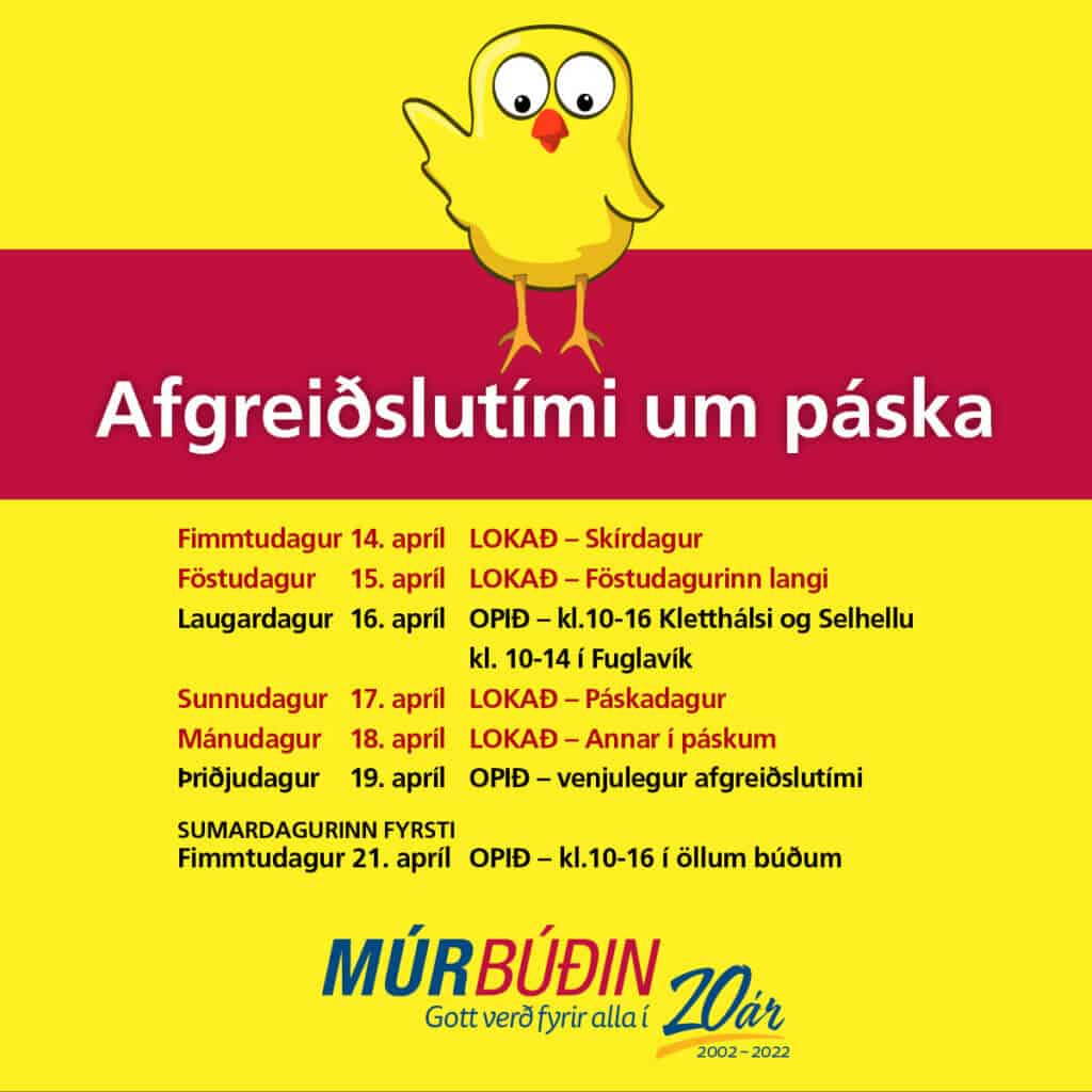 Verslanir Múrbúðarinnar eru lokaðar á skírdag, föstudaginn langa, páskadag og annan í páskum. Við erum með opið á laugardaginn 16. apríl Klettháls og Selhella 10:00-16:00 Fuglavík 10:00-14:00 Opnum á þriðjudaginn 19. apríl klukkan 08.00 stundvíslega. Njótið páskanna og við hlökkum til að sjá ykkur Múrbúðin – Gott verð fyrir alla, alltaf
