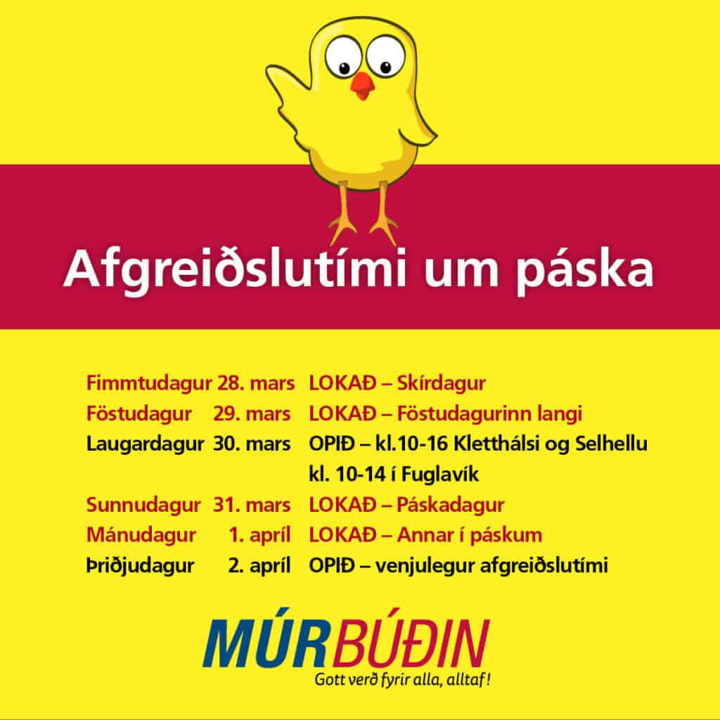 Verslanir Múrbúðarinnar eru lokaðar á skírdag, föstudaginn langa, páskadag og annan í páskum. Við erum með opið á laugardaginn 30. mars Klettháls og Selhella 10:00-16:00 Fuglavík 10:00-14:00 Opnum á þriðjudaginn 2. apríl klukkan 08.00 stundvíslega. Njótið páskanna og við hlökkum til að sjá ykkur Múrbúðin – Gott verð fyrir alla, alltaf