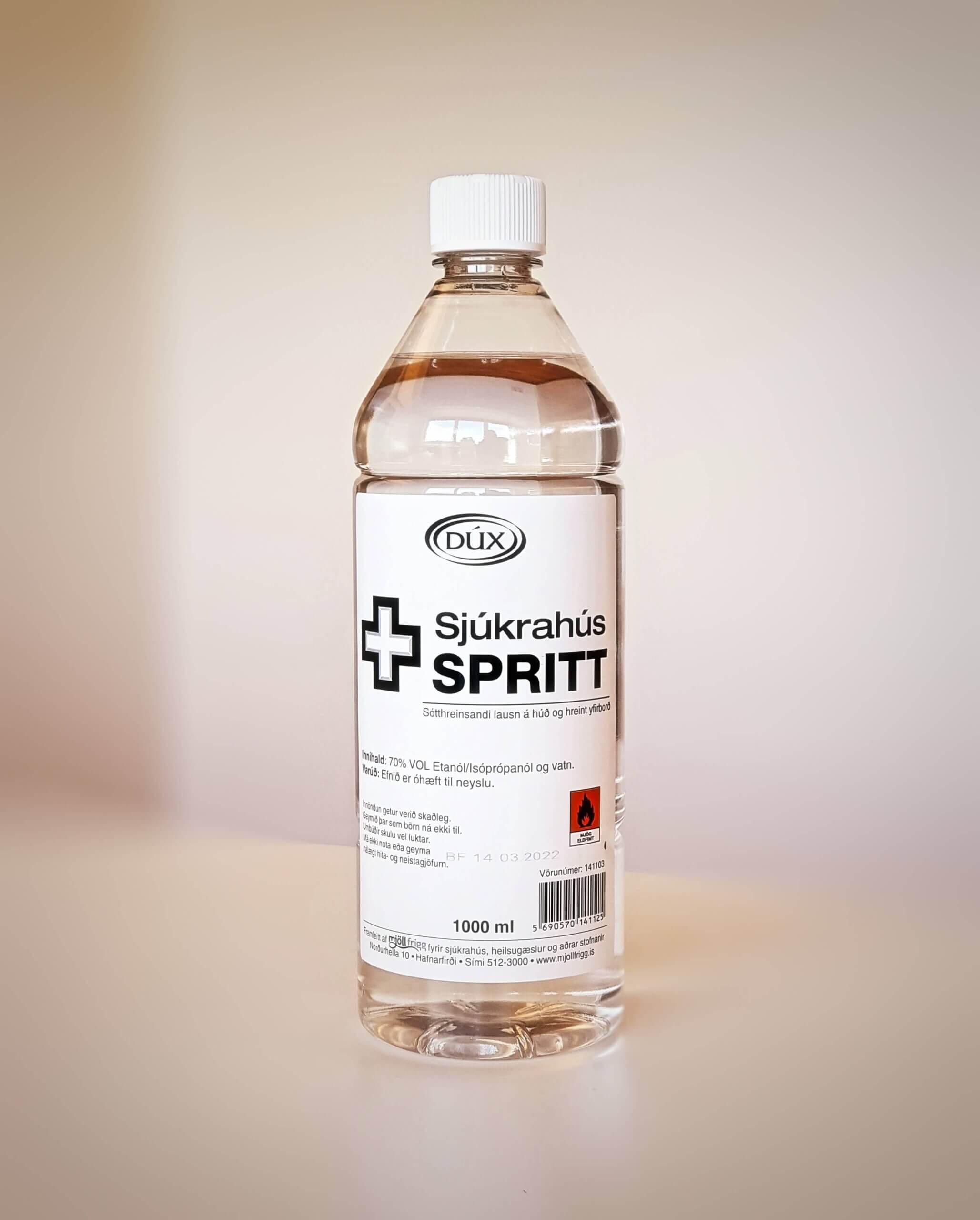 Dúx Sjúkrahússprit er sótthreinsispritt til almennrar sótthreinsunar á hlutum og má einnig nota á húð.