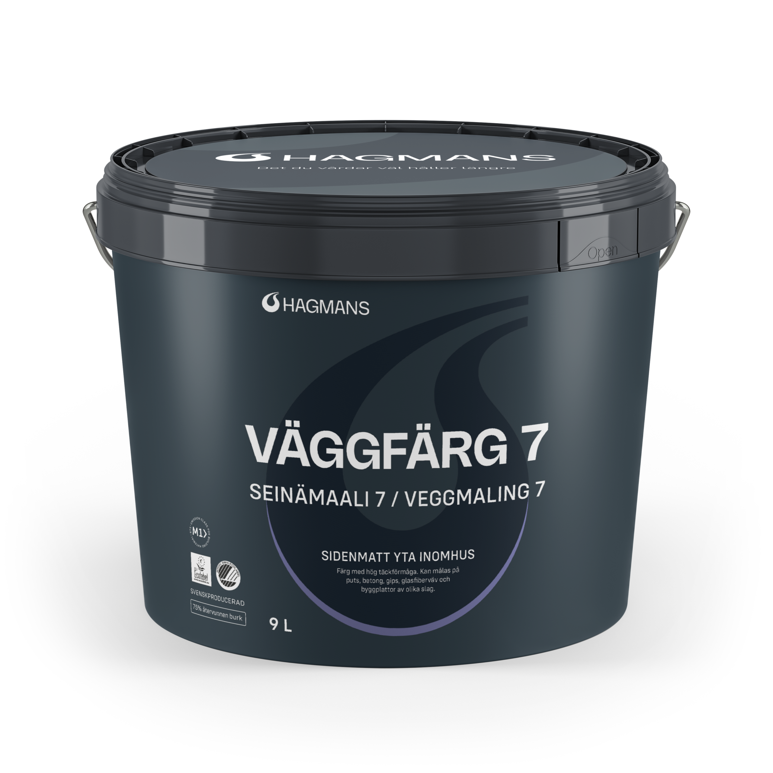 Hagmans Väggfärg 7 innimálning er silkimött, akríl málning, sem er lyktarlaus, Svansvottuð og með EU Ecolabel.
