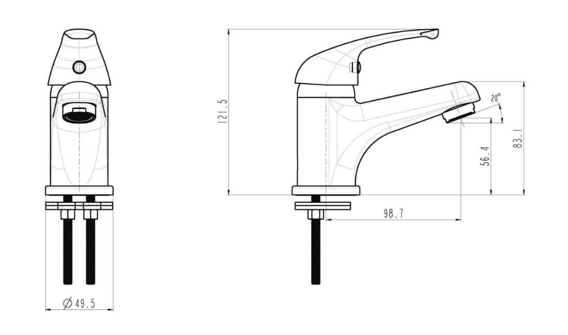 98,7 mm lengd frá miðju tækis að miðju stúts x 121,5 mm hæð