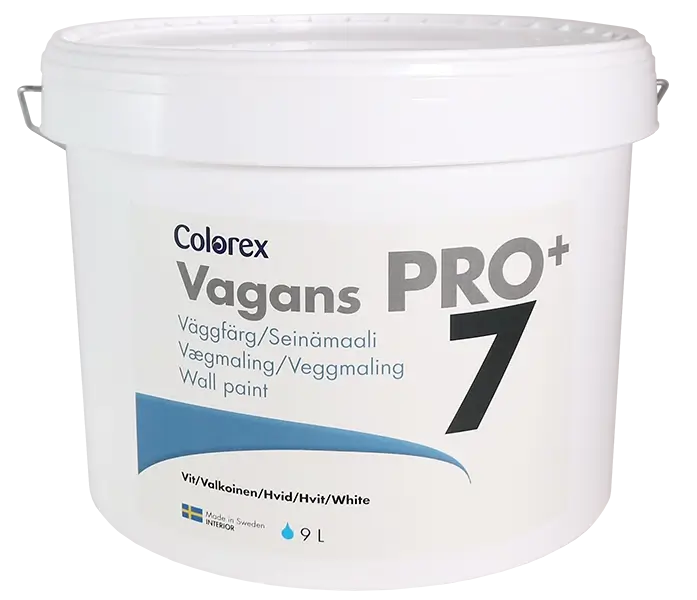 Vagans Pro+ 7 innimálning er mjög sterk og þvottheldin og hentar því jafnt til heimilisnota sem og í verslunar- og skrifstofurými. Málningin hentar vel til sprautunar.