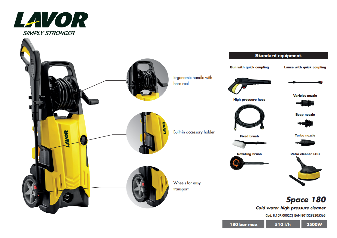 Lavor Space 180 háþrýstidæla, sem sameinar allt það besta sem Lavor hefur uppá að bjóða. Öflugan mótor, mikinn þrýsting og alla aukahluti sem þú þarft til að þrífa vel. Innbyggt slönguhjól auðveldar geymslu.