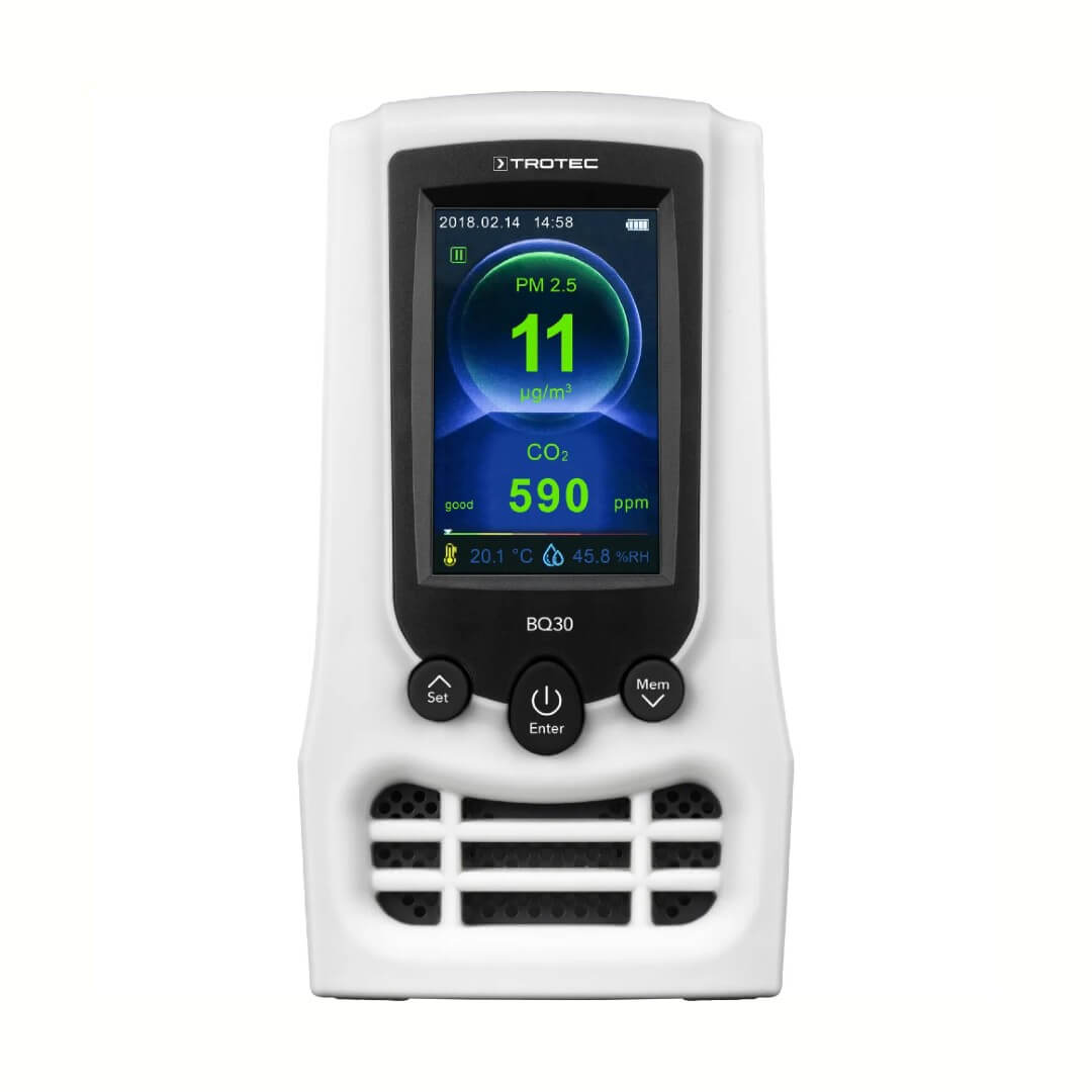 Loftgæðamælir frá Trotec sem mælir og sýnir styrk fíngerðs svifryks í umhverfinu.