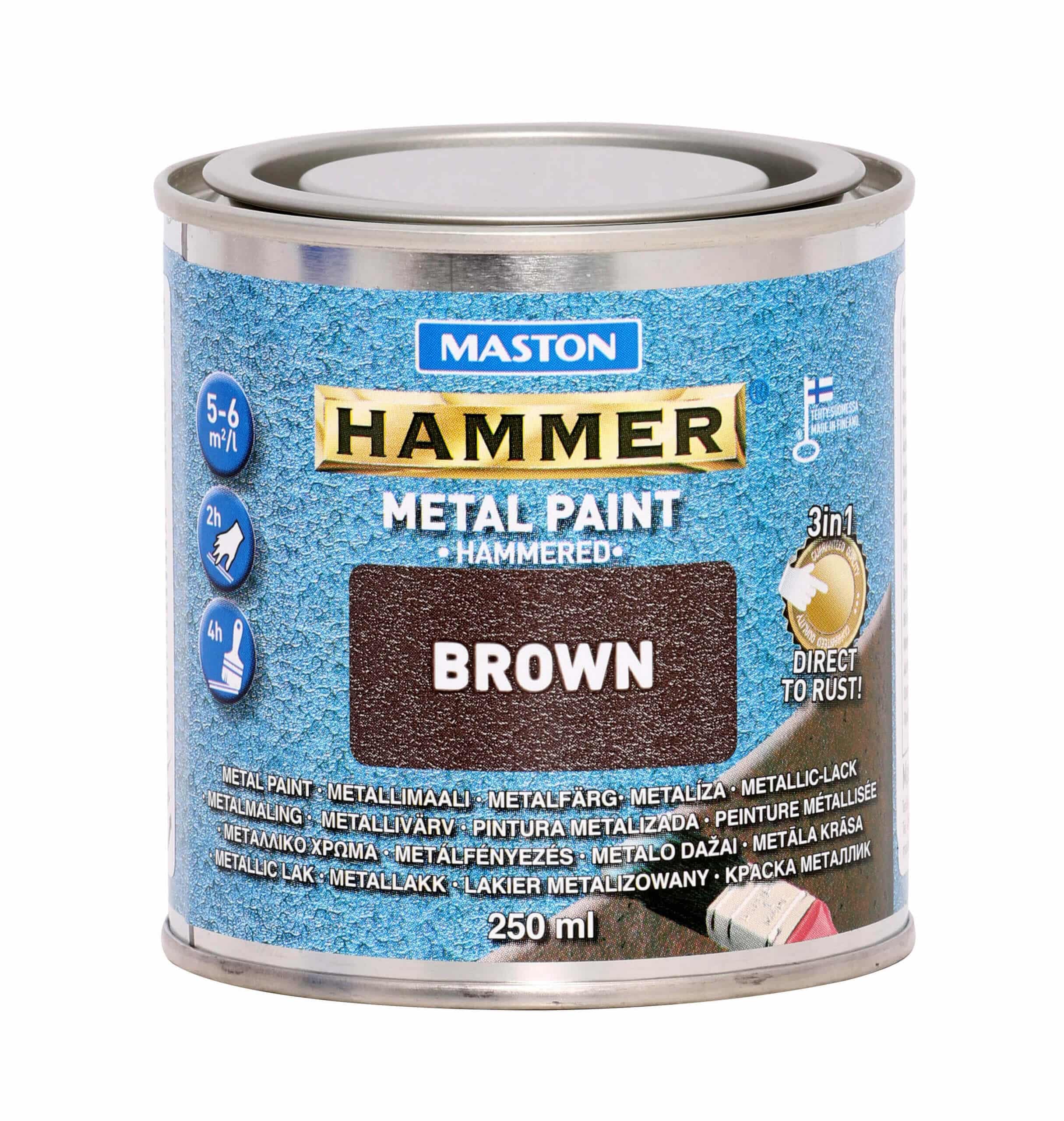 3 efni í einni dós: ryðvörn, grunnur og litur. Glansandi, sterk og mjög slitþolin yfirborðsáferð og einstaklega endingargott yfirborð með aðeins einni málaðri umferð. Hægt er að mála nýjan og gamlan málm og einnig beint á ryð. Auðvelt er að mála á áður málaða járn- og stálfleti með Maston HAMMER málmmálningu. Hentar líka á viðarfleti.
