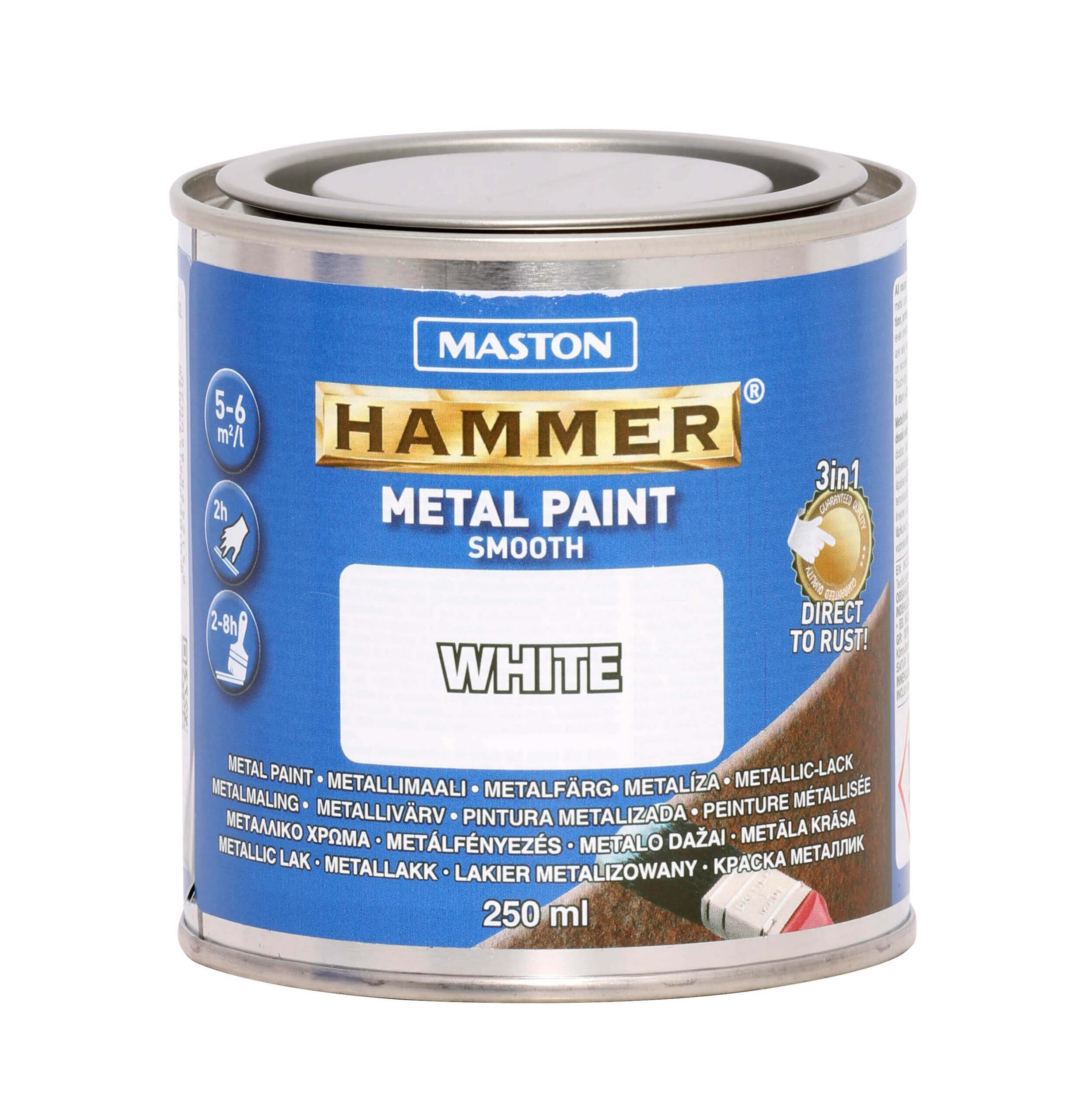 3 efni í einni dós: ryðvörn, grunnur og litur. Glansandi, sterk og mjög slitþolin yfirborðsáferð og einstaklega endingargott yfirborð með aðeins einni málaðri umferð. Hægt er að mála nýjan og gamlan málm og einnig beint á ryð. Auðvelt er að mála á áður málaða járn- og stálfleti með Maston HAMMER málmmálningu. Hentar líka á viðarfleti.