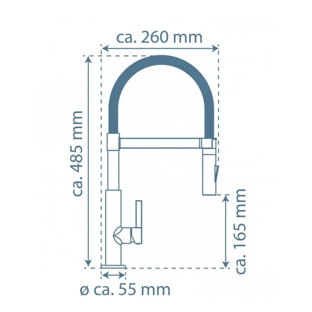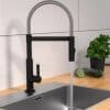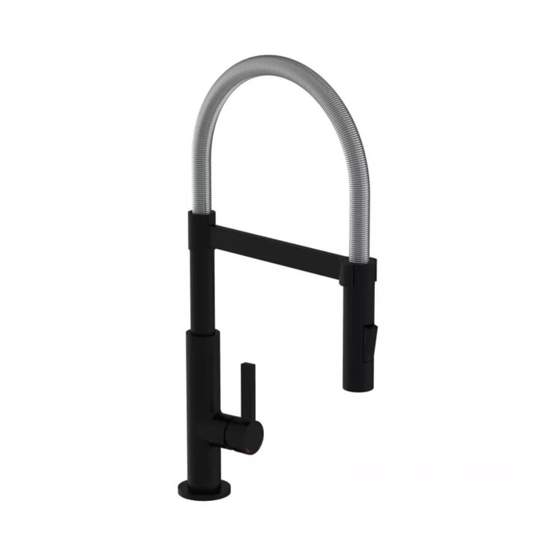 Eldhústækið er matt svart með krómuðum sveiganlegum barka, mattur svartur úðari með tveim stillingum.